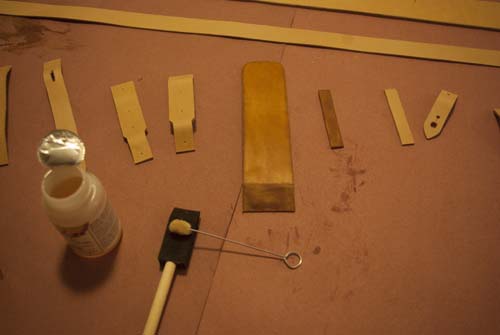 laid out, then a set of foam brushes and wool daubers is used to evenly spread a very light coat of oil on each